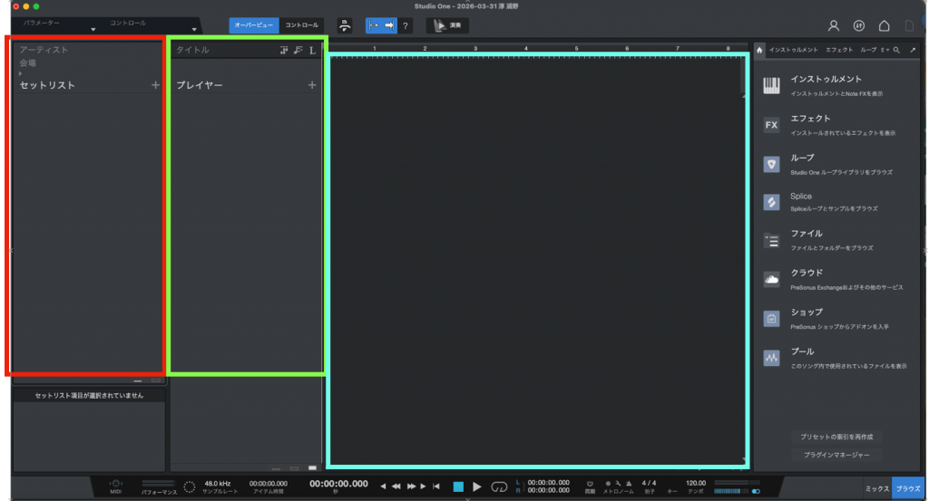 この色分けされた3つのブロックの役割だけ覚えれば、普段studio oneを使用されてる方なら理解も早いと思います