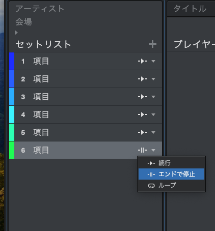 項目の右隣のマークを押すとその曲は繰り返すのか、そのまま次の曲へ行くのか、それとも再生し終えたらたらストップすのかが選べます